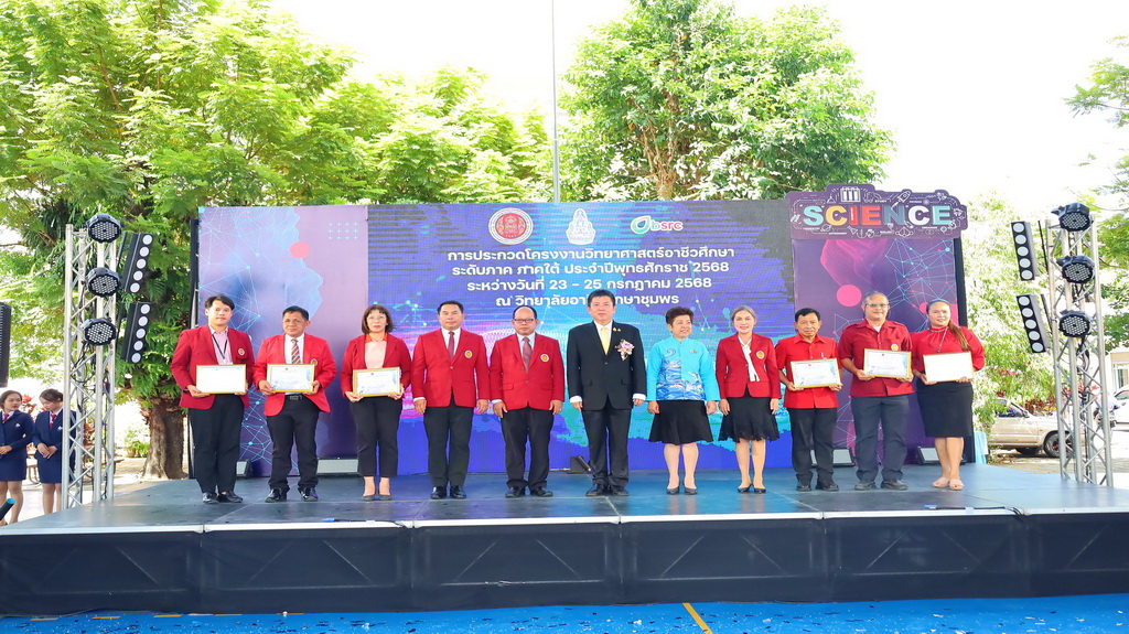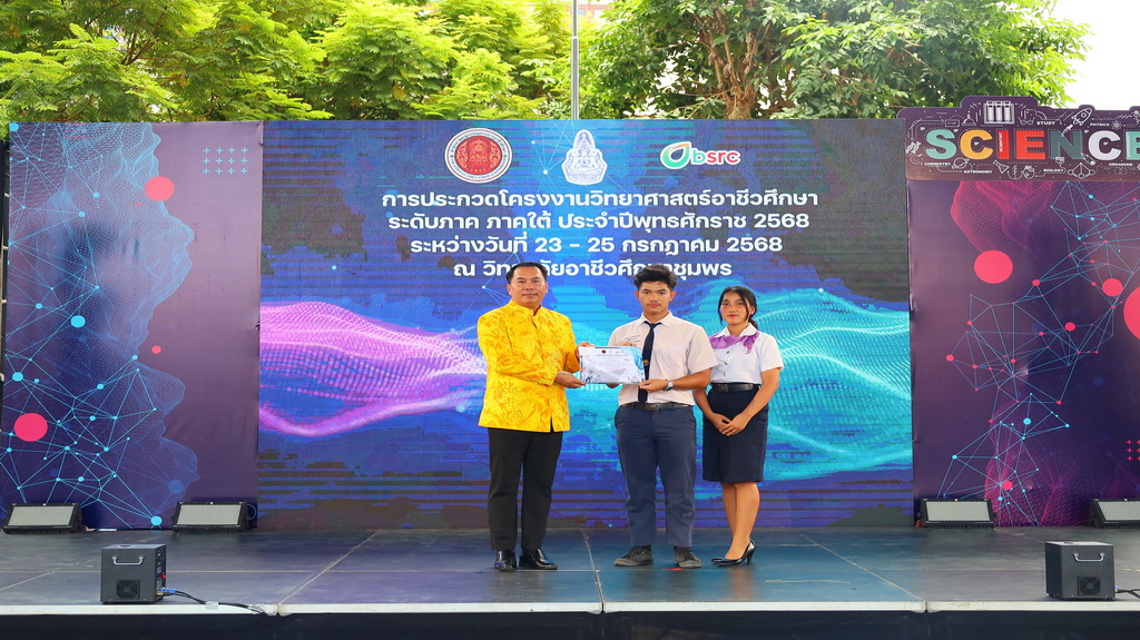 วันที่ 23 - 25 กรกฎาคม 2568 ด้วยสำนักวิจัยและพัฒนาการอาชีวศึกษา มีนโยบายขับเคลื่อนการประกวดโครงงานวิทยาศาสตร์อาชีวศึกษาประจำปีพุทธศักราช 2568 โดยสำนักงานคณะกรรมการการอาชีวศึกษามอบหมายให้ศูนย์ส่งเสริมและพัฒนาอาชีวศึกษาภาคใต้ ร่วมกับสำนักงานอาชีวศึกษาจังหวัดชุมพร เป็นเจ้าภาพการประกวดโครงงานวิทยาศาสตร์อาชีวศึกษา ประจำปีพุทธศักราช 2568 ระดับภาคใต้ เพื่อคัดเลือกผลงานโครงงานวิทยาศาสตร์ เข้าร่วมการประกวดโครงงานวิทยาศาสตร์อาชีวศึกษา ระดับชาติต่อไป ณ วิทยาลัยอาชีวศึกษาชุมพร อำเภอเมืองชุมพร จังหวัดชุมพร