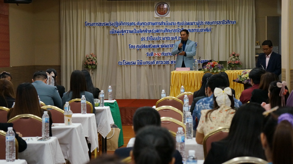 วันที่ 9 - 10 กันยายน 2568 ดร.อภิชาติ เนินพรหม ผู้อำนวยการศูนย์ส่งเสริมและพัฒนาอาชีวศึกษาภาคใต้ จัดโครงการอบรมเชิงปฏิบัติการยกระดับคุณภาพการดำเนินงานศูนย์บ่มเพาะผู้ประกอบการอาชีวศึกษา เพื่อมุ่งสู่ความเป็นเลิศสำหรับสถานศึกษาอาชีวศึกษาเอกชนภาคใต้ ประจำปีงบประมาณ พ.ศ. 2568 ได้รับเกียรติจาก นางสาวนิภาพร ระยะเพิ่ม สำนักบริหารการอาชีวศึกษาเอกชนมีสถานศึกษาเข้าร่วม 19 สถานศึกษา ณ โรงแรม บีพี แกรนด์ ทาวเวอร์ อำเภอหาดใหญ่ จังหวัดสงขลา